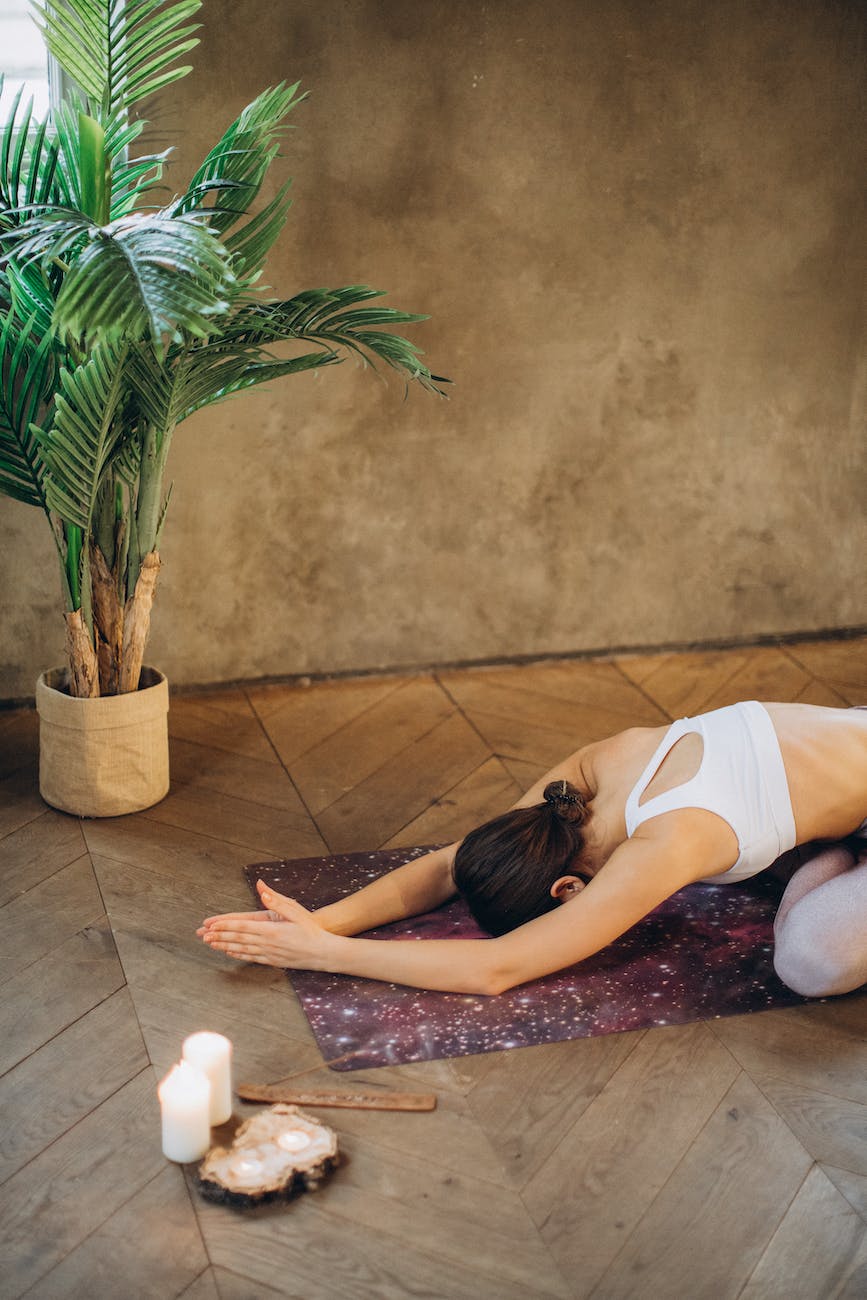 - Child’s pose (Balasana): This pose is a great way to stretch out the back and hips and is perfect for winding down after a long day. Take a few deep breaths as you sink into the pose, allowing your chest to rest on the ground and your hips to move back towards your heels. Hold for 3 minutes.